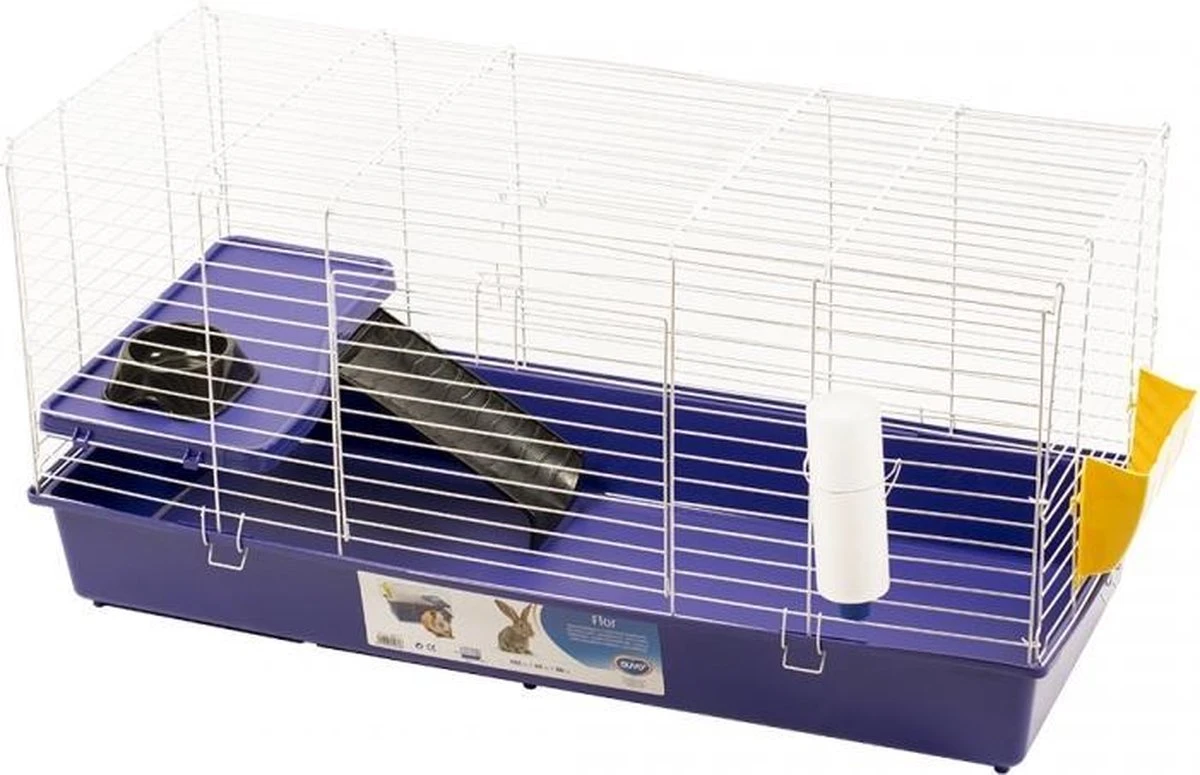 De hamsterkooi flor van Duvo+ is een kooi met een deurtje inclusief drinkbus, voedselbakjes en trapje.