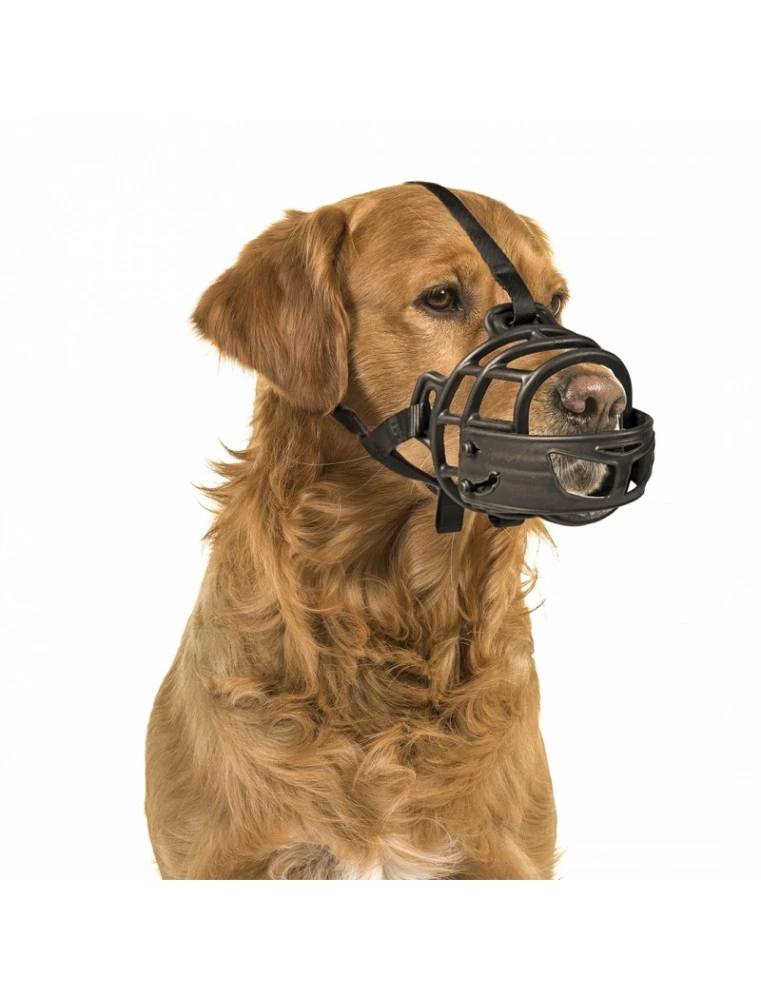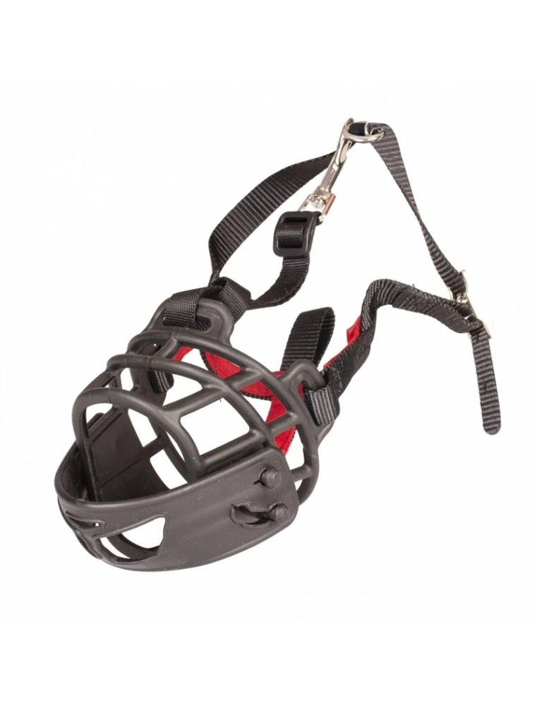 Deze Duvo+ muilband is gemaakt van sterk en duurzaam rubber voor een maximale veiligheid. Het houdt de kaken van jouw hond op elkaar en voorkomt bijten, kauwen en blaffen. Er is voldoende ruimte voor jouw hond om te drinken en te hijgen. Zet de voorkant van de muilband open zodat jouw hond gemakkelijker kan eten en drinken. De muilkorf is zeer comfortabel door de ergonomische, buigzame pasvorm en de neopreen voering rond de kin. De drie bevestigingsmogelijkheden zorgen voor extra veiligheid. Bevestig de riempjes m.b.v. de verstelbare gesp en trek de band aan. Span de muilband niet strakker dan noodzakelijk aan! Onder de kin bevindt zich een lus, waar de normale halsband doorheen kan. Je kan ook de extra veiligheidsriem bovenaan de muilband m.b.v. de karabijnhaak in de D-ring bevestigen., Kleur: Zwart/rood, Afmeting: 14,5x11x11