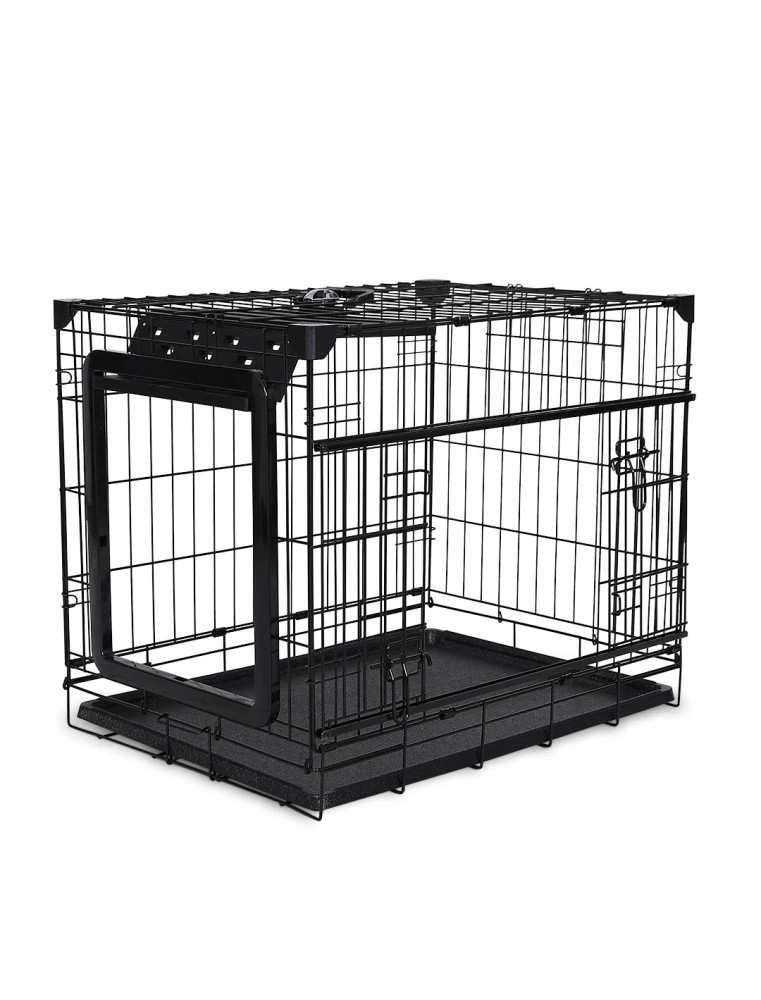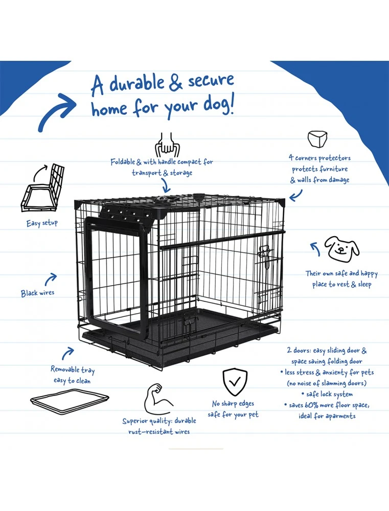 Deze Topline hondenbench van duvoplus is een duurzaam en veilig huis voor jouw huisdier. De 4 hoekbeschermers en de dikke, roestvrije draad maken deze draadkooi heel robuust en inzetbaar voor alle hondenrassen. Heel handig in gebruik met zijn 2 gepatenteerde & plaatsbesparende deuren, een schuifdeur en een handige vouwdeur waardoor de bench ook in kleine ruimtes, appartementen of bij transport in de wagen kan worden gebruikt. De vouwdeur heeft een veilig slotsysteem waardoor de deur niet kan toeklappen als hij open staat. Minder lawaai zorgt voor minder stress en angst bij jouw dier. Makkelijk inklapbaar, met draadhandvat en uitneembare kunststof lade.