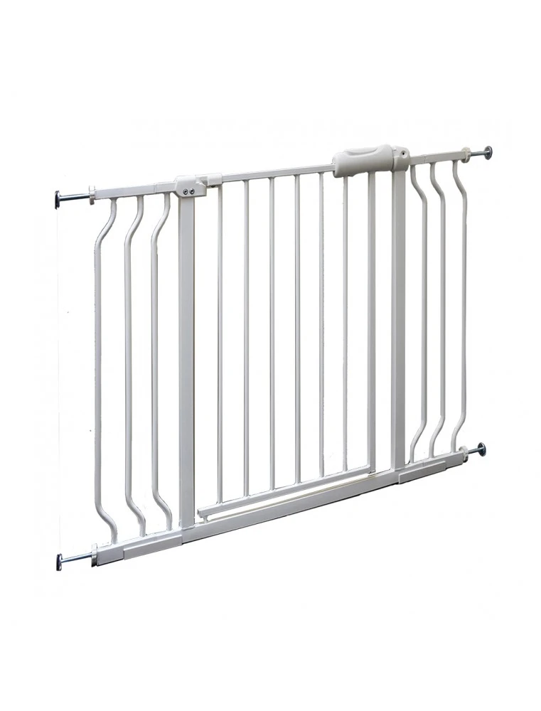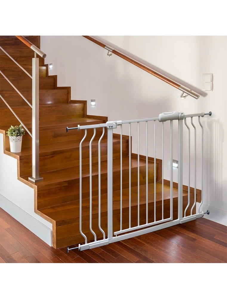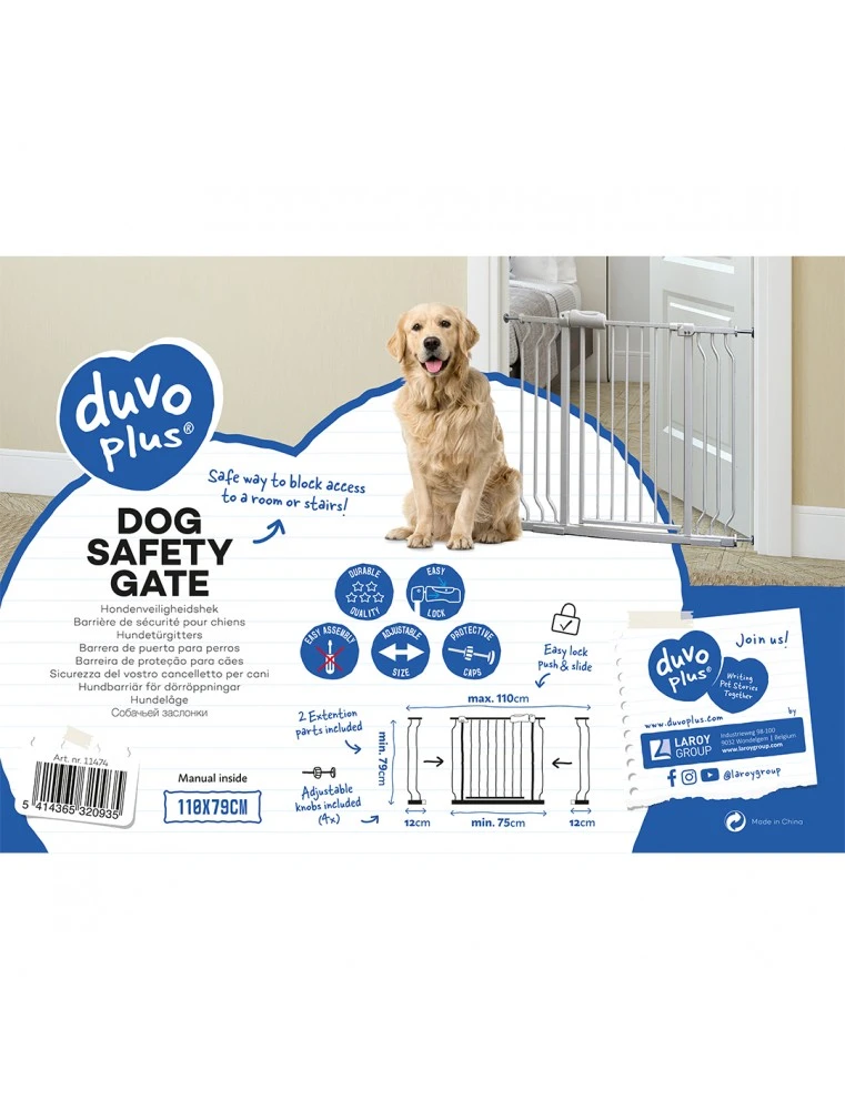 Iedereen heeft zo wel wat ruimtes waar je hond beter niet komt, vaak uit veiligheid. Dit veiligheidshekje van Duvo+ schermt die ruimtes af. Dankzij het gemakkelijk openen en sluiten van het slot kan je zelf wel nog de ruimtes betreden. Het hekje kan gebruikt worden voor deuropeningen, gangen en traphallen van min 75cm tot max 110cm, inclusief het gebruik van beide verlengstukken. De verpakking bevat 1 veiligheidshekje met slot en kabel, 2 verlengstukken en 4 regelbare stelschroeven. Je hebt geen extra gereedschappen nodig voor de installatie. Bovendien vermijdt je elk risico op beschadiging van deurlijsten of muren door de flexibele beschermkappen op de stelschroeven.