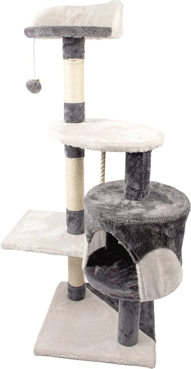 Met deze krabpaal kan je kat heerlijk klimmen, relaxen en spelen. Met maar liefst drie plateaus kan de kat zelf de gewenste hoogte uitkiezen om over de kamer uit te kijken. Aan het ene plateau zit een speeltouw, aan de andere een balletje aan een elastiek waardoor de kat gestimuleerd wordt om te spelen. Het slaaphuisje is bekleed met zachte stof. Daarnaast is de krabpaal voorzien van meerdere sisalpalen. In de krabbehoefte van de kat wordt dus ook zeker voorzien.